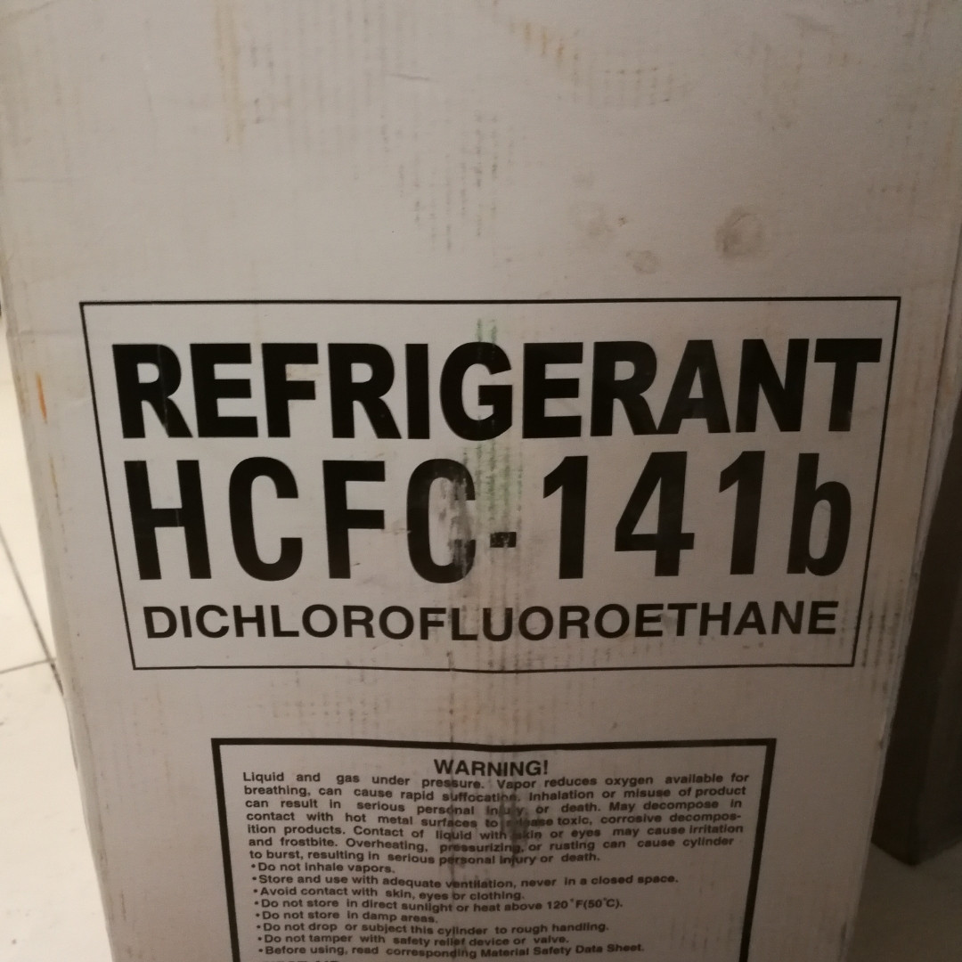 Хладагент R141b нельзя смешивать со сжатым воздухом или кислородом, но можно смешивать с сухим азотом; все источники открытого огня должны быть убраны от установки во время использования R141Ь, в частности, нельзя проводить сварочные работы; так как R141b тяжелее воздуха, необходима хорошая вентиляция помещения. Масса - 13.6 кг